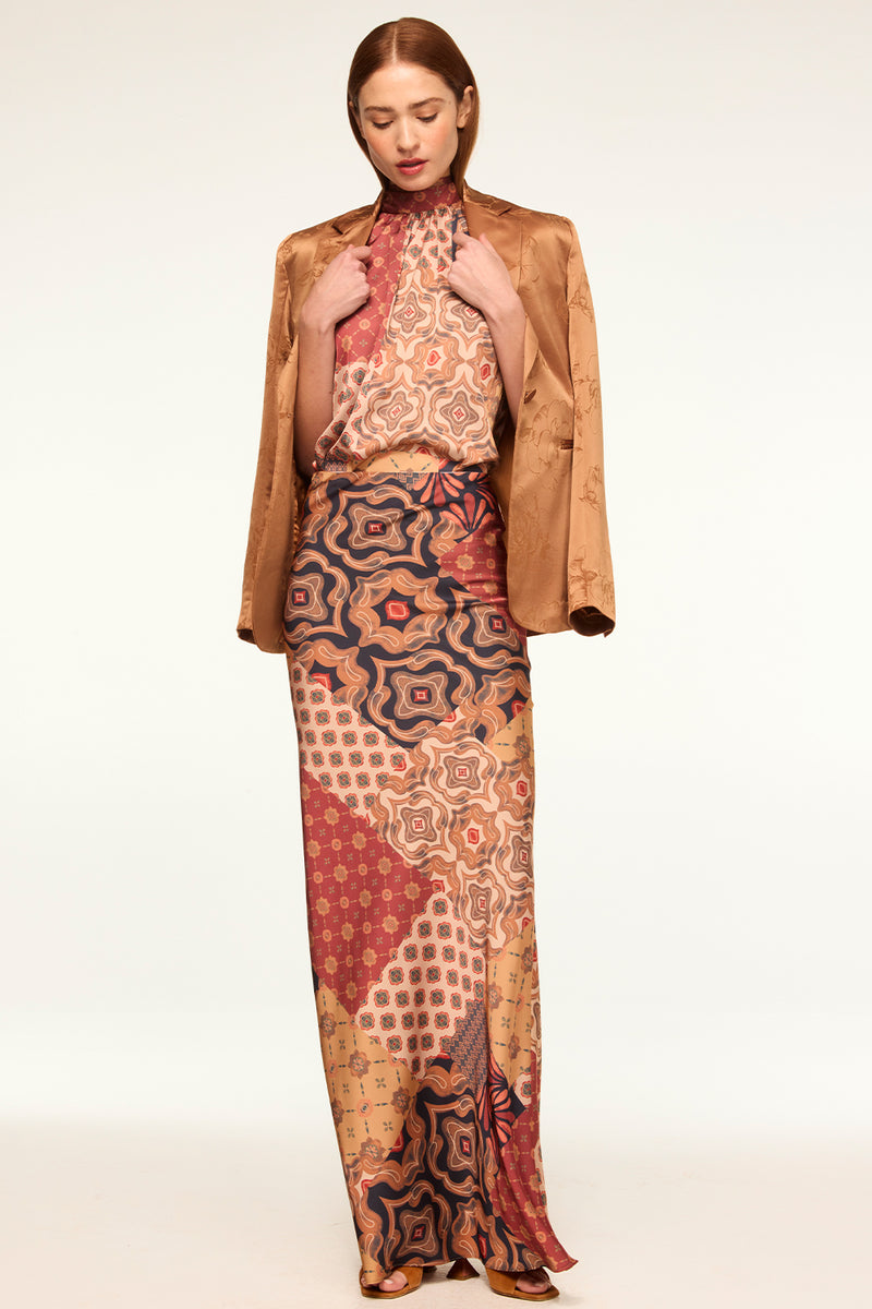The sleeveless Luka top is an easy high-neck sleeveless silhouette cut from a Surreal Patchwork printed satin. Featuring a self-tie at the neckline, this versatile style can be paired with everything from the coordinating Sierra skirt to jeans and our Lauren blazer.
