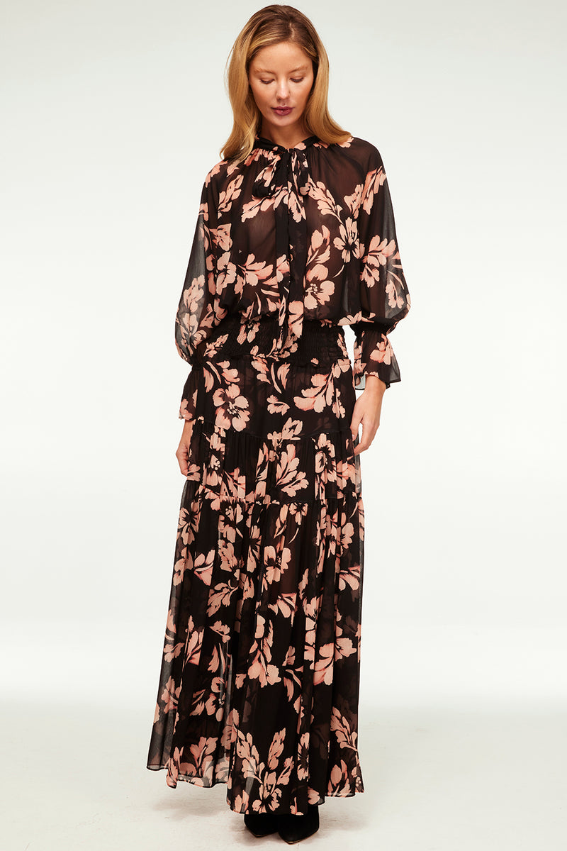 Effortlessly chic, the Gracie top is cut from a semi-sheer Auric Flora printed chiffon. Long sleeves with a ruffle cuff and a high neckline features a neck-tie that can be worn loose and undone for a laid back look or tied in a bow. Pair with denim for an effortless look or with the coordinating Bar or Sierra skirt tucked in for a stylish set.