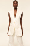 Our Delia vest is a longline silhouette in a white cotton blend. A notched fold-over collar and v neckline with single button closure. Slightly padded structured shoulders. Back vent and double front slit pockets. Wear alone or over one of our tops like the Lira or Roya. Complete the set with the coordinating Juno pant.
