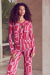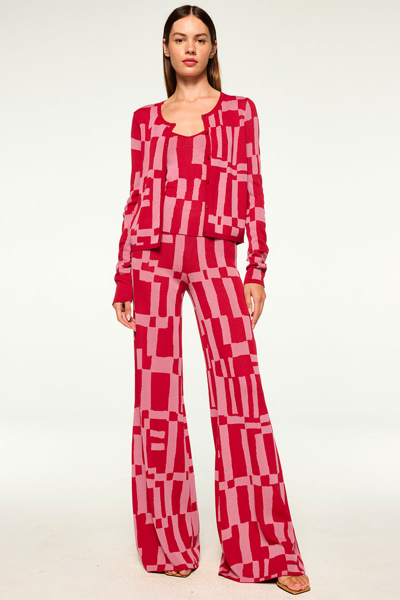 Elvin is a chic stretch knit cardigan in a two-tone red and pink geometric pattern. Featuring a round neckline, long sleeves and red enamel buttons. Pair with the coordinating Koa pant for a bold set. Wear alone or on top of the coordinating Una camisole.