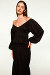 Halia is a versatile new top you will turn to for seasons to come. Cut from a breezy black cotton poplin and featuring long blouson sleeves with elastic cuffs that can be worn on or off-the-shoulder for added versatility. A deep v neckline and elasticized ruching for a flattering waist detail. Poplin hem. Pair with jeans or the coordinating Elna skirt.