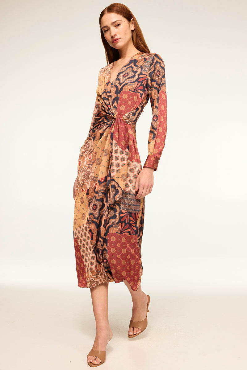 Eliza stuns in our fall-ready Surreal Patchwork satin. This chic midi dress is a wrap style with a gathered self-tie waist. A v neckline with long sleeves and button cuffs. Pair with everything from knee high boots to mules.