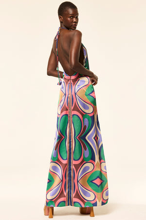 The Samantha Dress is a striking halter maxi cut from our luminous Butterfly Mirror–printed satin. The neckline ties with signature petal tassels, while a dramatic open scoop back flows into a sweeping skirt with double thigh-high slits. Finished with a...
