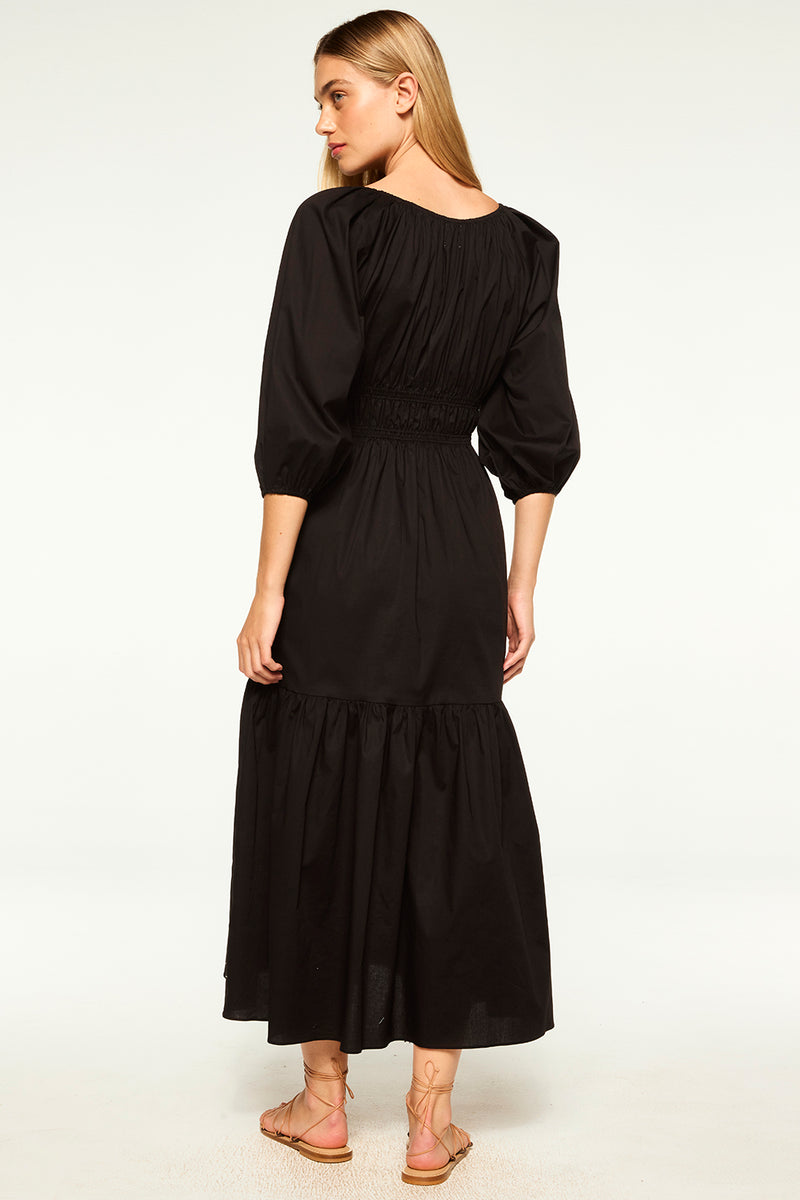 Our new Yasenia maxi is cut from a breezy black cotton poplin and features voluminous three-quarter sleeves with elastic cuffs. The elasticated neckline can be worn on or off-the-shoulder. Features a elasticized ruched waist detail and side slit pockets that lead into an ankle grazing wide ruffle hem. Dress this effortless and versatile wardrobe staple up with bold jewelry and heels or with flats for a chic daytime look.